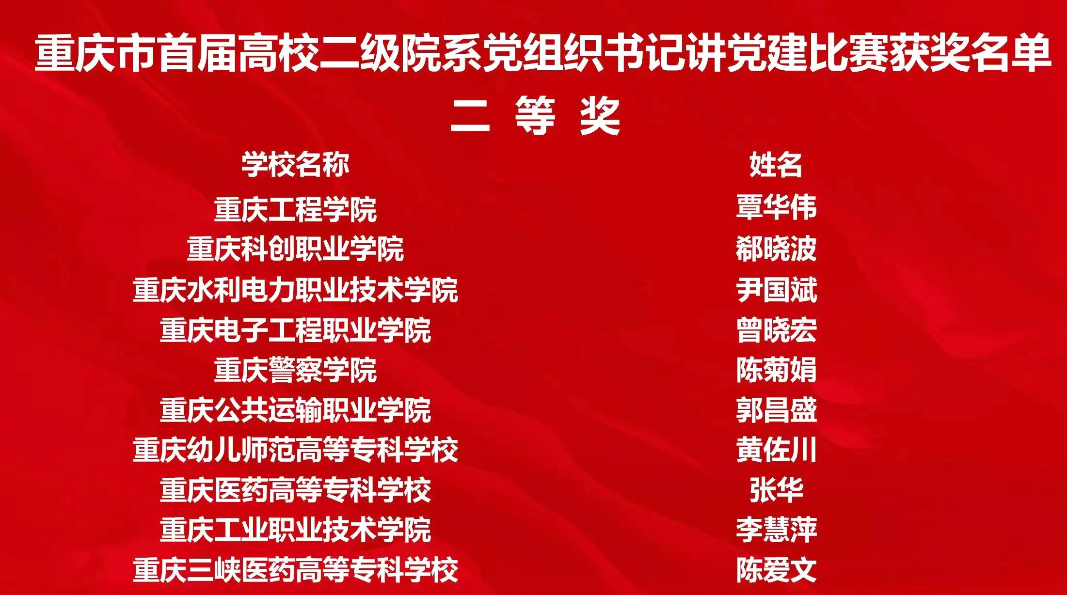 11月27至28日,由中共重慶市委教育工委主辦的重慶市首屆高校二級院系黨組織書記講黨建比賽在重慶師范大學(xué)舉行。本次比賽本專科同組,共有來自全市各高校共70名選手同臺競技。我校經(jīng)濟(jì)管理學(xué)院黨總支書記郗曉波榮獲二等獎。