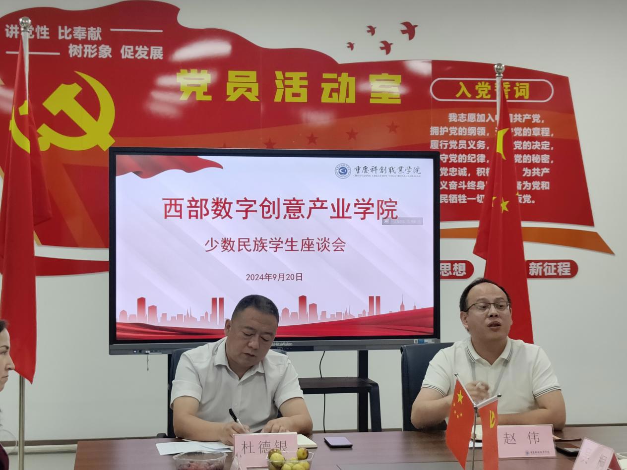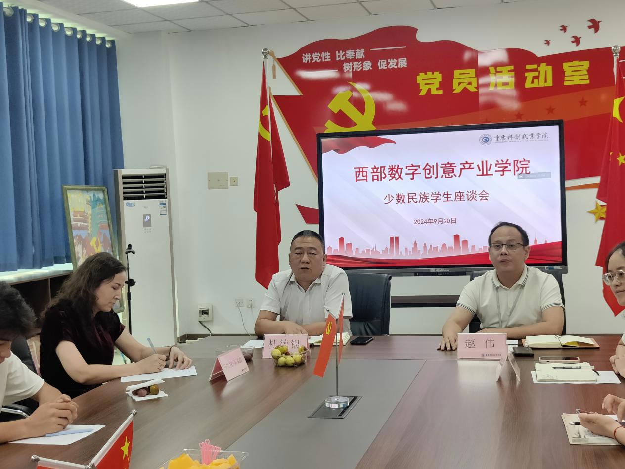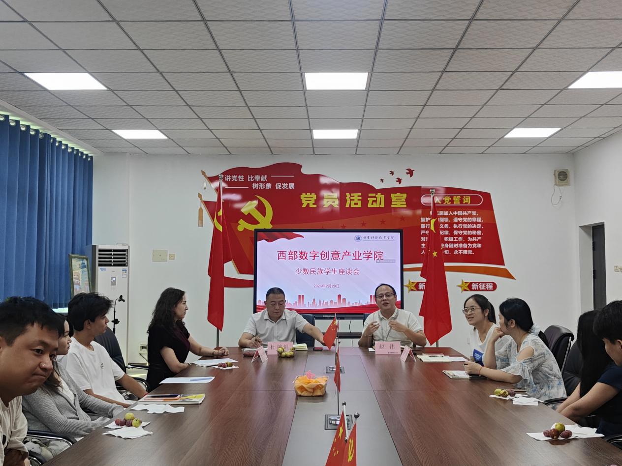為進一步加強與少數(shù)民族學生的溝通和交流,營造民族一家親的良好育人氛圍,促進民族團結(jié)進步,鑄牢中華民族共同體意識。西部數(shù)字創(chuàng)意產(chǎn)業(yè)學院于9月20日上午,在精益樓405召開了少數(shù)民族學生座談會。學院院長杜德銀、黨支部書記兼副院長趙偉、新疆外派老師瑪依拉?買買提、團總支書記吳桐以及各班輔導員和少數(shù)民族學生代表參加會議。
